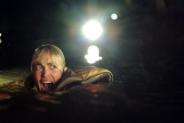 Enfin, et en plus des qualités déjà évoquées, le film va proposer des attaques super nerveuses et surtout très étonnantes. Ainsi, la première victime disparait prématurément quand tout le monde a le dos tourné, mais la deuxième se fait littéralement croquer, puis éjecter dans l’eau dans une figure artistique que même les juges de plongeon auraient apprécié. Les passages gores ne sont pas nombreux, et résultent bien souvent des restes de repas de ce cher crocodile gigantesque. Tout cela reste bien fichu et bien sale, notamment quand on visite l’antre de la bestiole. Les effets spéciaux sont relativement bien faits, et j’ai même été surpris par les images numériques et les incrustations qui demeurent vraiment très bien. Les passages en animatronic sont bien fichus aussi, ne révélant qu’une partie du crocodile. McLean se révèle être un réalisateur très malin, proposant des plans assez savoureux, comme le regard fugace du crocodile avant de bouffer un type ou encore le passage sur le fil tendu, moment impressionnant de pression et de tension. La reste conventionnelle comme on le voit souvent dans ce genre de productions.