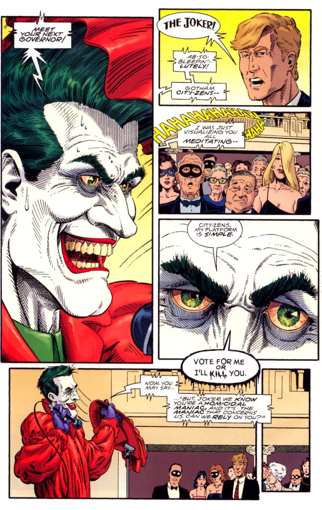 Le deuxième arc est de loin le plus intéressant, même si dans le fond, il est plus léger que le premier récit. La première chose qui frappe est le dessin qui prend un vrai coup de jeune. Il est plus énergique, plus dense, plus précis et c’est un vrai plaisir à suivre. Néanmoins, et c’est assez marrant, ce dessin garde un côté rétro assumé, notamment dans sa façon de représenter les méchants et les pièges mortels du Joker. Dans cet arc narratif, la politique est toujours au centre du sujet, montrant ainsi la folie douce du Joker, mais elle sera moins corrompue et montre justement des personnages assez bons. Ce qui est le plus appréciable c’est que l’on va voir la psyché du Batman, revenant sur ses peurs primales, grâce à l’Epouvantail qui signe son retour mais on va aussi voir une guerre intestine entre méchants et notamment Double-Face et le Joker. Ce qui change énormément par rapport au premier arc, c’est que le Joker est vraiment plus violent, laissant aller sa folie et torturer purement et simplement une jeune femme, allant jusqu’à l’étrangler pour qu’elle perde connaissance. On remarquera aussi du sang, des morts et même un homme démembré. Cet aspect gore est hallucinant dans un Batman, mais il colle finalement bien à la noirceur actuelle du héros.