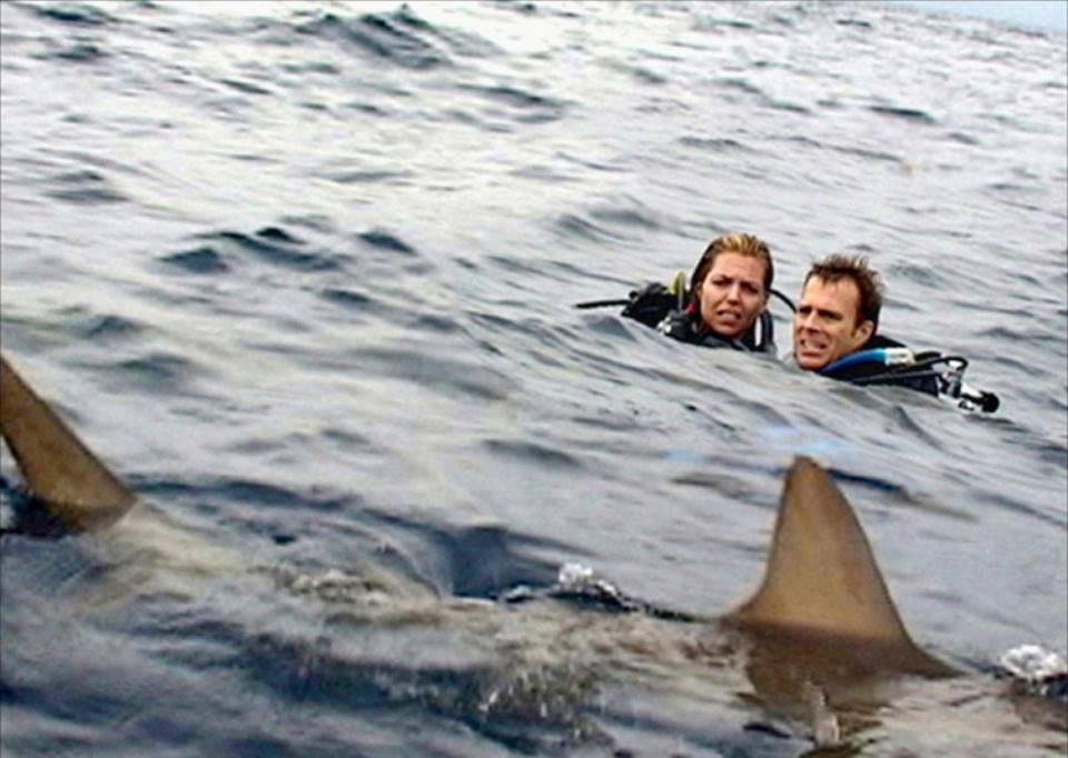Mais, ce qui m’a vraiment dérangé, c’est l’intrigue en elle-même et la bêtise des personnages qui vont se laisser dériver pendant des heures sans même chercher à s’en sortir, ou nager dans un sens ou dans l’autre, alors que les squales se font de plus en plus présents. Puis, alors que le temps passe, les personnages sont étrangement sereins, et il va leur falloir six ou sept heures passé dans l’eau avant de commencer à paniquer… Bref, je dois dire que le scénario m’a énervé au possible et beaucoup ennuyé aussi, car hormis les deux coups de pression que le film m’a mis, pour le reste, on se fait chier devant. Car, niveau rebondissement, il n’y a rien, à part d’essayer de s’en sortir, le couple passe son temps à s’engueuler et se réconcilier au beau milieu des requins… Oui, c’est évident… De plus, et ça n’arrange pas les choses, le film est agrémenté de dialogues parfaitement débiles, du genre : « On va se faire manger tout cru par les requins », et j’en passe et comme les acteurs n’y mettent pas du leur, si c’est ça la peur et la tension dont parle la comm’ du film, on peut faire amplement mieux. Bref, je me suis retrouvé devant un film parfaitement répulsif.