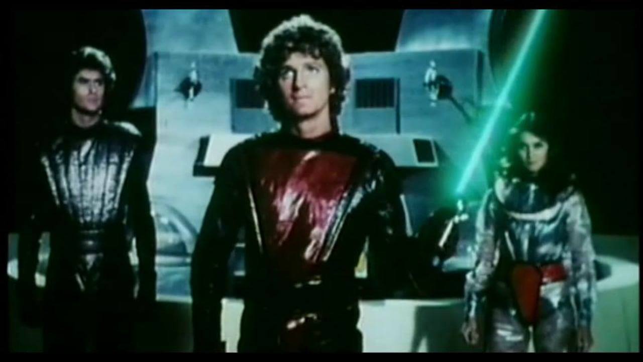 En enfin, il y a ce casting de luxe, totalement improbable et tellement drôle en même temps. Au grès de ces aventures surréalistes, on pourra retrouver un Christopher Plummer mono-expressif, qui ne croit pas une seule seconde à son rôle et se contente de débiter ses dialogues sans conviction. Joe Spinell m’a carrément fait mourir de rire, dans le rôle de ce grand méchant qui détient un rire démoniaque et se croit au-dessus de tout. L’acteur est terrible et l’on sent qu’il s’éclate, peut-être même qu’il y croit à fond et ça le rend captivant. On trouve en personnage principal la « James Bond Girl » Caroline Munro qui se balade en petite tenue pendant tout le film. Et oui, dans le froid intersidéral, la petite culotte et le débardeur très court sont de rigueur ! Et c’est génial, car l’actrice n’est pas crédible dans le rôle et joue comme une patate, alors heureusement pour elle que tout le film est comme ça, car on prend plaisir à suivre ses aventures incroyables. On trouvera aussi David Hasselhoff tout brushing de sortie dans un petit rôle. Mais bon, tout ce petit monde se fait presque voler la vedette par un acteur complément dément et possédé par son rôle. Cet homme, c’est Marjoe Gortner qui est carrément hystérique et décalé dans le rôle d‘Akton. L’acteur est si drôle qu’il m’a fait mourir de rire à chacune de ses apparitions.