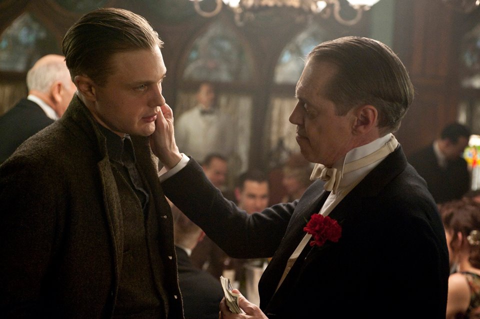 Et enfin quatrièmement, les acteurs sont tous investis dans leurs personnages, un casting grand luxe, car elle se paye des acteurs plus habitués au grand écran. En premier, on trouve un Steve Buscemi hyper charismatique, on a l’impression que le rôle lui était prédestiné. Tour à tour impitoyable ou charmeur, c’est un grand jeu de manipulation que le comédien nous offre, ainsi qu’un personnage en or avec de multiples facettes. Un personnage détestable et qu’on va pourtant adorer. Autour de lui gravitent des personnages tout aussi bons. Son homme de main joué par Michael Pitt est un personnage captivant. Jimmy Darmody est un petit truand qui va apprendre le métier, aussi froid que jovial, on peut dire que c’est le meilleur rôle de Michael Pitt à ce jour. On retrouve avec plaisir Stephen Graham qui joue Al Capone en début de carrière. L’immense et flippant Michael Shannon est un agent de la prohibition on ne peut plus énigmatique et passionnant. La belle et anglaise Kelly MacDonald est la femme de la série et elle arrive à s’en tirer haut la main au beau milieu de tous ces hommes. On pourrait citer aussi Shea Whigham (le Sherif Thompson), Vincent Piazza (un rital de merde…), Paz de la Huerta (une profiteuse bien dévergondée) ou encore Michael K. Williams (un trafiquant et partenaire de Nocky), Gretchen Mol (la maman de Jimmy), il y en a tellement et chaque acteur est si bien dans le décor qu’ils mériteraient tous d’être mentionné.