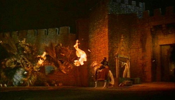 Loin de pouvoir prétendre à des ambitions folles par ses moyens très restreints, ce ne sont pas les effets spéciaux qui vont remporter un franc succès, l’animation et les trucages inégaux laissent à désirer mais font preuve d’une certaine débrouillardise. Manque de fougue évident, les affrontements et évènements se déroulant lors du périple ne sont pas exaltants non plus malgré quelques idées amusantes, que ce soit l’affrontement face à l’ogre-loup-garou (qui tombera après avoir eu le tournis), en passant par un tourbillon hypnotique de grande chaleur dont on peut se demander comment les deux chevaliers se sont laissés avoir, jusqu’au final où, après avoir terrassé le dragon à deux têtes bien rapidement, George doit affronter le septième et dernier fléau qui n’est autre que Lodac lui-même qui est encore plus vite expédié ! Cependant comme dit précédemment, le budget n’est pas le même pour ces productions que ceux alloués aux canons de l’époque, la même année vient de sortir « Jack le tueur de géant » et 4 ans plus tôt sortait « Le septième voyage de Sinbad » tout deux réalisé par Nathan Juran et en 1963 sortira « Jason et les argonautes » de Don Chaffey qui ont, quant à eux, bénéficié de l’apport du maître en la matière Ray Harryhausen.