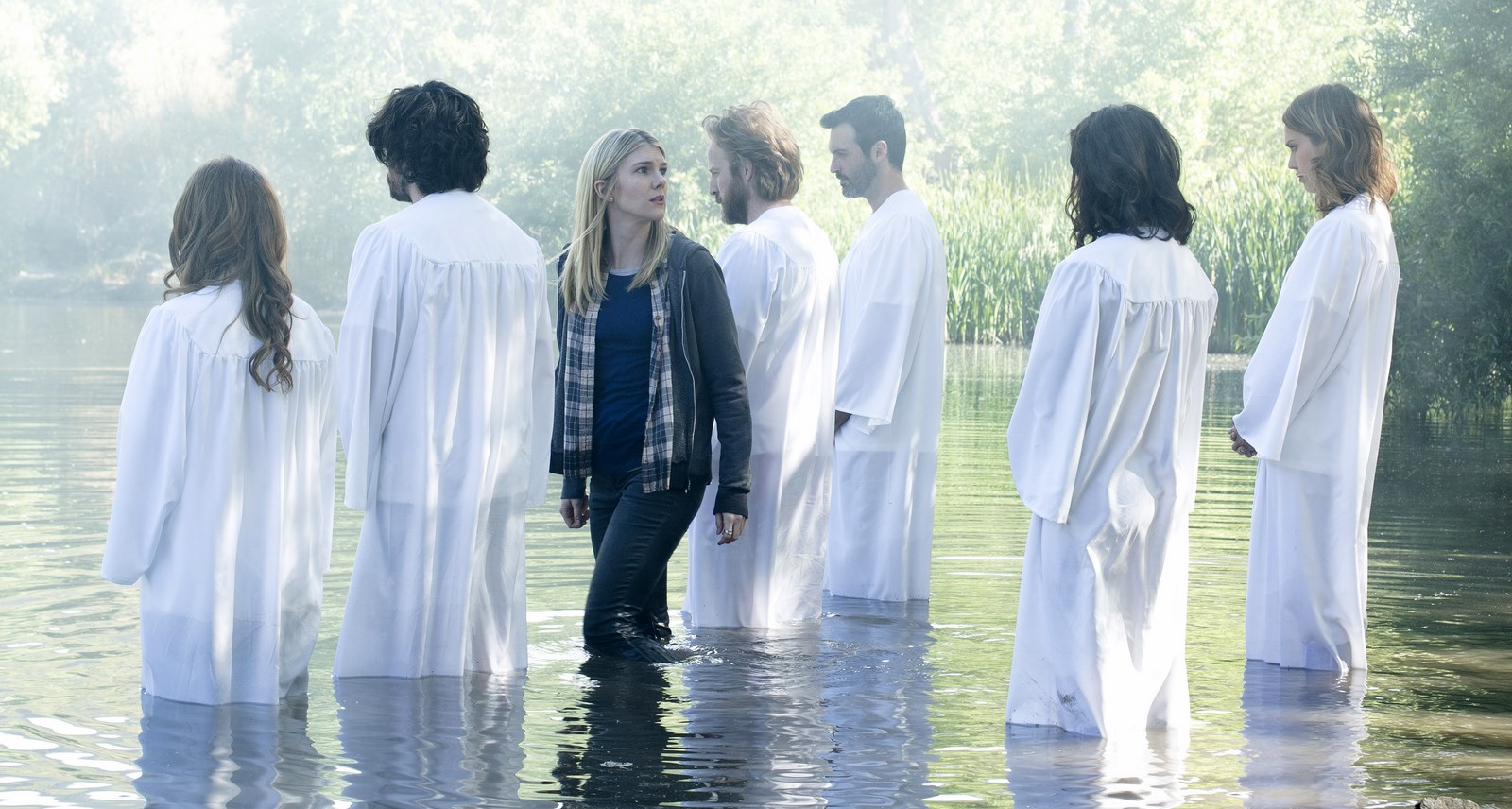 Le film se concentre sur une secte qui aurait réellement existé dans les années 80 aux Etats-Unis. Il y a un suicide de masse et une seule survivante. Quelques années plus tard, une équipe de télé souhaite faire un reportage sur le lieu et amène avec elle l’unique survivante qui a bien grandi depuis. On est typiquement dans le genre de film qui veut faire du survival surnaturel. Un genre pas si commun même si les lieux que l’on va visiter seront d’une banalité affligeante. Des bois, des maisons dégueulasses, une ambiance délétère et froide, bref, tous les clichés sont réunis pour ne pas perdre le spectateur avide de films d’horreur basiques. Et on ne peut pas reprocher à Phil Joanou d’essayer de faire quelque chose de plutôt classique, arpentant doucement le chemin de l’esprit démoniaque pour mieux brouiller les pistes. Cependant, il faudrait expliquer la nécessité de coller un filtre gris au film, lui donnant une teinte trop sombre et rendant quelques passages absolument illisibles, comma la fouille de la maison abandonnée. Certes cela permet d’assombrir l’image afin de rendre le tout assez glauque, mais au final, cela fait plus mal aux yeux qu’autre chose.