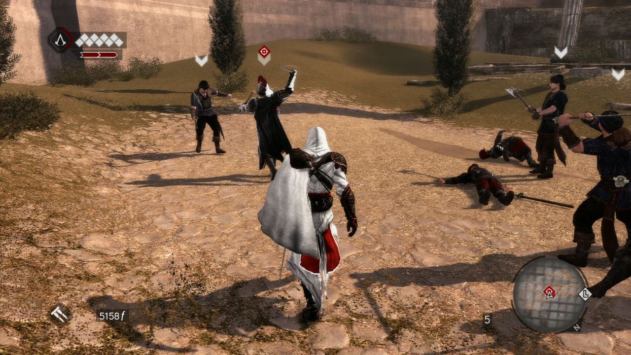Graphiquement parlant, le jeu est très réussi, même s’il subsiste quelques inégalités. On voit rapidement que l’accent a été mis sur les décors et les bâtiments. En effet ces derniers sont très beaux et très bien modélisés. Le Colisée est un exemple, magnifique structure que l’on voit de loin. Par contre, pour les personnages, les mouvements des habitants sont toujours aussi brusques et les bugs de collision sont très nombreux. Il n’est pas rare que la cape d’Ezio se fonde dans un personnage. Les visages, bien que bien faits, aurait pu être affinés et les expressions un peu plus travaillées. Par contre, la bataille finale dans le feu est excellente et vraiment prenante, une réelle réussite, tant au niveau du scénario que de l’intensité de la scène, qui ressemble à un procédé cinématographique. Le jeu possède aussi quelque chose d’assez pénible, c’est la taille de la carte, qui est immense mais il faut parfois du temps pour aller d’un point à un autre. Le système de tunnel dans les égouts n’est pas très pertinent, car il faut les restaurer, ce qui coute de l’argent et parfois, ils sont tout de même éloignés de là om l’on doit aller. Le cheval semble être une bonne chose, notamment en campagne, mais c’est un calvaire dans la ville. Au niveau de la jouabilité, on reste dans du classique pour les vieux routards des Assassin’s Creed, mais les néophytes se feront vite la main, car il suffit d’un touche pour courir et s’accrocher et le tout se fait avec une facilité déconcertante. Le seul problème, c’est que parfois Ezio court et saute là où il ne faut pas et meurt bêtement. Les combats sont assez dynamiques bien que redondants, les phases d’infiltration sont basiques et l’arbalète est très difficile à utiliser (personnellement, je ne l’ai jamais utilisée). A noter aussi des bonus si l’on réussit les missions avec une condition, mais cela ne sert à rien.
