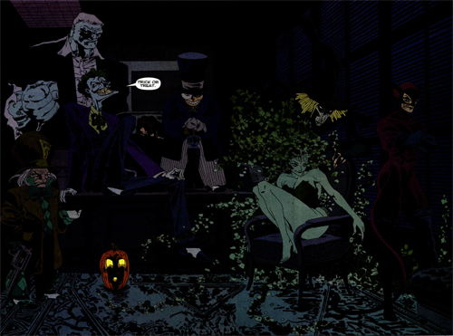 D’habitude, les histoires de super-héros sont toujours un peu identiques. On a un gros méchant qui fait de vilaines choses et notre héros vient pour le friter et lui mettre la misère. Depuis quelques temps, cet adage ne fait plus partie des comics, car la recherche de nouveaux points d’ancrage se fait sentir et le public demande toujours quelque chose de mature et de novateur. Un Long Halloween n’est pas une aventure comme les autres pour Batman. En effet, il s’agit-là d’un polar, à l’ambiance sombre et à l’enquête digne des plus grands policiers. Il s’agit d’une suite directe à Batman Année Un de Frank Miller. Alors que le triumvirat Batman, Gordon et Dent cherche des preuves pour inculper le Romain, le plus grand mafieux de la ville, un tueur sème le trouble dans cette enquête, ne tuant que les personnes de la famille du romain les jours de fête et en laissant un objet en lien avec la fête. La presse le baptise alors Holiday. Se sentant menacer, le Romain va faire libérer des malades d’Arkham, créant un chaos et un surplus de travail pour Batman. Alors pour quelqu’un qui adore les méchants, car ce sont bien eux qui font le héros, on est gâté. C’est bien simple, ils sont quasiment tous présents et cela fait vraiment plaisir à voir. Ils servent bien l’histoire, s’imbriquant parfaitement entre les tueries du vrai vilain. Mais le plus intéressant, c’est que chaque méchant à son propre intérêt dans l’histoire, comme le Joker qui veut tuer tout le monde, en espérant buter Holiday dans la masse. Mais quand on s’éloigne un peu du récit et de tous les vilains, on se rend compte que l’on est devant un polar se rapprochant du Parrain de Coppola. Sombre, intrigant et surtout magnifiquement monté, le scénario laisse planer un doute sur le tueur tout au long de l’intrigue et même jusqu’à la fin. Nous sommes face à un vrai policier noir qui manipule habilement le lecteur. On verra ainsi les doutes des personnages, nos doutes à nous concernant l’identité du tueur, et la folie latente qui envahit Harvey Dent avant qu’il ne devienne Double-Face. Bref, il s’agit d’un récit riche et dense.