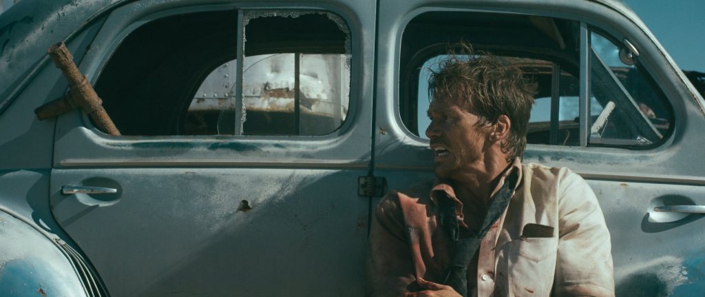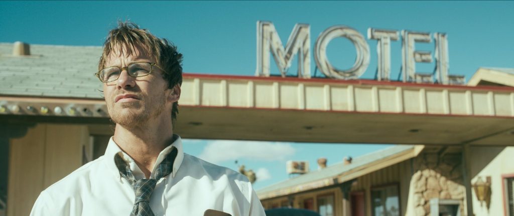 Ce dernier a un parcours assez typique, réalisant de nombreux courts-métrages aux States et au Japon avant de s’attaquer à son premier vrai long. Némésis sera donc l’extension de Polaris, l’un de ses courts-métrages, et il sera tourné en 12 jours dans le désert californien. Avec Némésis, on va suivre Sam, un commerçant qui cherche de nouveaux clients dans les petits villages qui parsèment le désert californien, mais personne ne semble présent, ou tout du moins, personne ne souhaite lui ouvrir sa porte. Alors qu’il s’apprête à quitter la région, il se fait tirer dessus par un policier masqué. Dès lors, il va devoir se sortir d’un piège étrange et qui semble presque surnaturel. Et c’est là tout le sel de ce film assez sympathique, mais qui souffre de ses trop nombreuses références et de son rythme lancinant. En fait, avec ce film, il faut vraiment rentrer de suite dans le délire, sous peine de ramer pendant plus d’une heure. En effet, tout se joue sur l’ambiance poisseuse et chaude qui se dégage du film. On va se perdre comme Sam dans ce désert aride et on va se sentir complètement seul dans un environnement plutôt hostile. Le film est relativement malin et va distiller quelques moments d’angoisse pour renforcer un malaise déjà bien présent. Entre les couleurs rouges, l’effet de flou dû à la chaleur ou encore cette porte cadenassée dans le motel, tout est mis en place pour apporter un sentiment de malaise au spectateur.