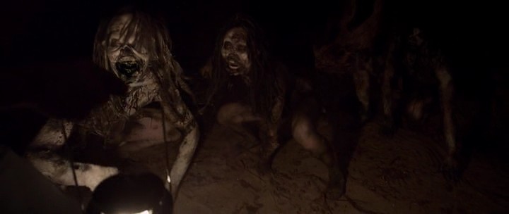 Parce que la suite n’est vraiment pas fameuse. On va rapidement apprendre que si les gens font des sacrifices animaliers, c’est parce qu’il y a dans la forêt et les cavernes entourant le village, des créatures humanoïdes qui n’hésitent pas à zigouiller le quidam qui n’aurait pas la force de faire une offrande. Entre l’homme des cavernes et le démon, ces créatures vont faire régner la terreur dans cette pauvre petite bourgade. Et c’est bien là que le film va sombrer dans le bis le plus vide de sens. Les créatures refusent de tuer le médecin parce qu’il leurs est utile. En effet, il va permettre à une des créatures de donner naissance à un bébé, avant qu’elle meure d’une septicémie. C’est à ce moment-là qu’il se rend compte que les créatures sont cannibales et qu’il décide de prendre sa famille pour se barrer loin de là. On se rend bien compte que le film accumule donc les incohérences et n’arrive pas à trouver une trame intéressante pour son fond. Le côté « rednecks » racistes passe alors à latrappe pour sombrer dans un survival qui n’a ni queue ni tête, avec des créatures qui décident de kidnapper certaines personnes et d’en buter d’autres, de façon un peu aléatoire. Rajoutant à cela une histoire de secte et d’héritage familial maudit et on obtient une fin rocambolesque, d’une nullité abyssale.