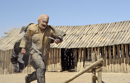 Le film commence très mal à cause d’un rythme lénifiant d’entrée de jeu. Le montage est apocalyptique, on ne comprend rien à ce qu’il se passe et tout cela est très peu bavard. On commence avec un cavalier black qui traine un cadavre pour le décapiter, puis on passe directement à un autre black qui attend près d’une voie ferrée où un chinois pompe pour faire avancer une vieille planche avec trois types tout de rouge vêtu, aux yeux jaunes et à la bouche cousue. Le cavalier black, alors caché derrière un arbre rabougri les attaque et essaye de soutirer des informations qu’il n’aura pas. On a alors une première scène gore, en image de synthèse avec une décapitation très mal foutue. Une voix off nous explique alors qu’il y a une zone dans le désert où les morts reviennent à la vie et que le cavalier black doit tuer une seconde ceux qui ont violé son amoureuse et qu’il a déjà tué une fois dans une prison. En gros, il s’agit d’un film de vengeance avec des démons dedans. Seulement, tout est bancal.