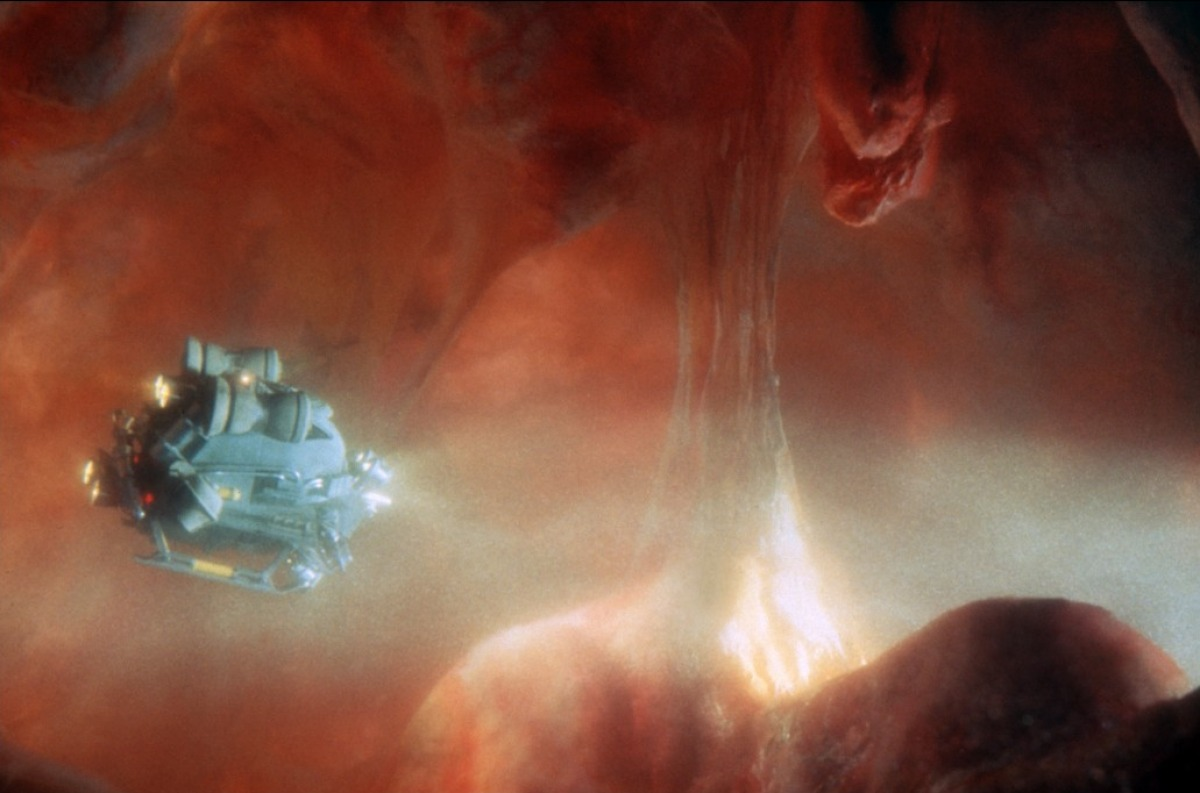 Si le scénario est aussi drôle que fou, la réalisation de Joe Dante tient quant à elle très bien la route. « L’aventure intérieure » est un film dynamique, puis au-delà de ça, c’est un film qui fourmille d’idées. Si tout ce qui se passe à l’extérieur est assez simple, quoi que le film a un fort côté cartoon dans certains de ses gags, le plus intéressant visuellement parlant, c’est ce qui se passe à l’intérieur, car Joe Dante et ses équipes aux effets spéciaux ont fait un sacré taf. Riche, coloré, sombre, étrange, tripé, allant même jusqu’à être angoissant dans certaines de ces idées, « ce huis clos » humain fascine par la reproduction des organes, de ces artères, de ces vaisseaux sanguins, et plusieurs séquences valent clairement le coup d’œil. Je pense notamment à l’appel du cœur, le petit voyage derrière les yeux, ou encore un combat complétement allumé qui finira dans l’estomac de notre pauvre hypocondriaque. À noter aussi une BO formidable signé Jerry Goldsmith !