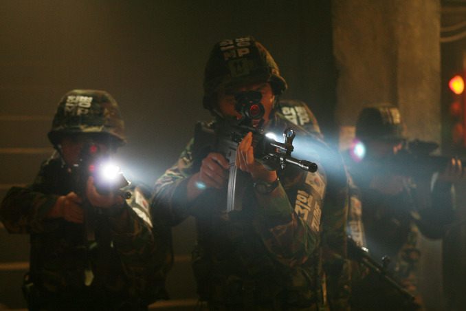 Le scénario est assez nébuleux. Pas forcément dans ce qu’il raconte, mais plutôt dans la façon qu’il a de raconter son histoire. Un groupe de militaire rentre dans un poste de garde à la frontière des deux Corées. A l’intérieur, dix-neufs corps, un homme dans un état critique, et un fou furieux armée d’une hache. Sur place est dépêché un commandant qui doit mener l’enquête pour comprendre ce qu’il s’est passé. Avec une équipe, il fouille alors le bunker, interroge le seul survivant, et le mal recommence. En gros, The Guard Post joue constamment sur la paranoïa et la crainte de l’autre. A la manière d’un The Thing de John Carpenter, le réalisateur coréen essaye de faire monter la tension entre les soldats et d’incriminer tout le monde sur la folie douce qui commence à se faire sentir.