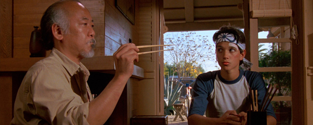 John G. Avildsen va prendre le temps de construire ses personnages et de brasser différents thèmes. Et les personnages, c’est clairement ce qui va être le plus important dans ce métrage. Daniel tient la place centrale. C’est un jeune homme bienveillant, empathique, qui va tomber amoureux de la mauvaise personne à cause de ses fréquentations. Battu, humilié et parfois même rejeté car considéré comme un looser, Daniel va se réfugier dans le karaté. Il apprend auprès d’un homme mystérieux, mutique, mais d’une grande générosité. M. Miyagi est un personnage lui aussi bienveillant, doux et qui se voit comme un père de substitution. Il conseille alors Daniel, lui apporte une sérénité, confiance en lui, tout en expliquant que la violence ne résout rien. Nous sommes face à deux personnages attachants, simples, et totalement crédibles. On peut se projeter à la place de Daniel, par exemple.