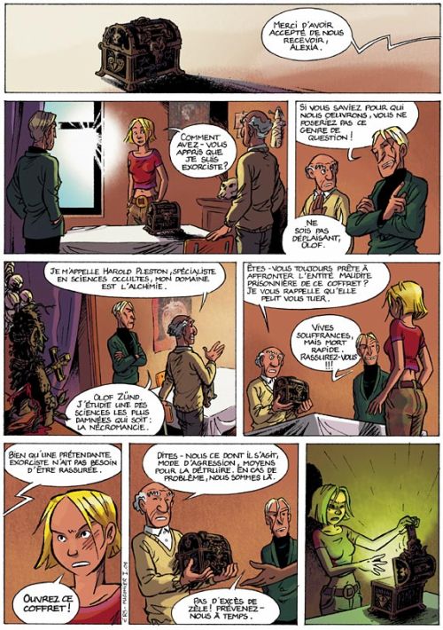 Voici une des premières pages, vous pouvez y voir Alexia, l’alchimiste Harold Pleston (homme presque chauve) et le nécromancien Olof Zünd (homme en veste verte). Comme vous pouvez le voir les dessins sont loin d’être les plus beaux qu’il nous a été permis de voir dans une BD, mais ceci reste une affaire de goût car ces graphismes peuvent tout de même plaire à certaines personnes même si ce n’est pas une majorité !