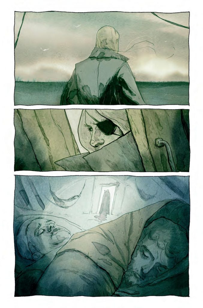Dès les premières pages, l’auteur nous plonge dans une ambiance assez mortifère et lugubre. Les couleurs chaudes de la taverne contrastent avec le bleu froid de la nuit et de l’extérieur, démontrant déjà une volonté de créer une atmosphère glaciale. La rencontre avec la jeune fille dans la rue ajoute un contexte angoissant, la représentant comme un spectre du bateau du capitaine. Vincenzo Balzano utilise tout son talent pour projeter une imagerie particulière, avec une aquarelle qui favorise des aplats de couleurs nuancées. Cette sensation de froid atteint son paroxysme à l’arrivée dans les terres glacées, avec ce qu’il faut d’apparitions effrayantes et de légendes. Les totems qui se dévoilent, l’exploration d’épaves au fond de l’eau, les masques qui flottent ou encore cet enfant qui vit au fond d’un des deux bateaux échoués, tout cela offre une atmosphère angoissante à souhait.