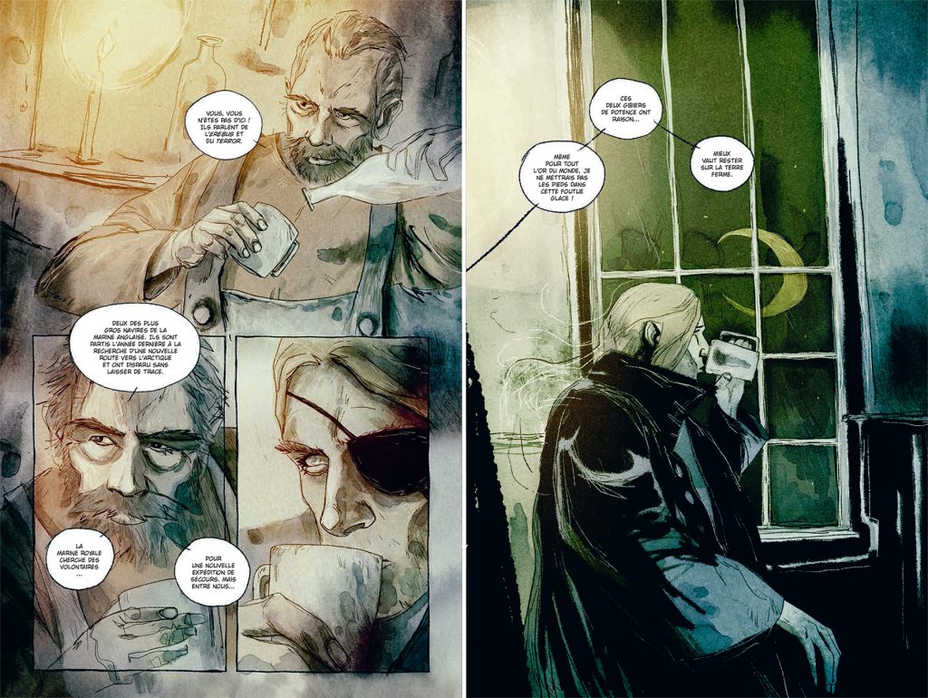 Et tout ceci va permettre d’explorer non seulement les légendes inuites, mais aussi de faire des références à des auteurs connus. Difficile de ne pas penser à H.P. Lovecraft malgré l’absence de tentacules. Ici, l’ambiance froide, l’exploration maritime et terrestre d’un territoire glacé, les quelques géants qui viennent peupler les cauchemars de certains marins, tout ceci évoque l’écrivain de Providence. Difficile aussi de ne pas penser à Dan Simmons et son roman Terreur, avec ce bateau pris dans les glaces. Vincenzo Balzano brasse de nombreuses références, mais il trouve aussi son identité. Dans le dessin bien évidemment, absolument splendide (certaines planches sont des tableaux à encadrer), mais aussi dans le déroulement de son histoire, qui perd le lecteur entre réalité et fantasmes éthérés. Une vraie réussite sur le plan visuel, qui nous fait voyager dans des territoires effrayants et envoûtants.