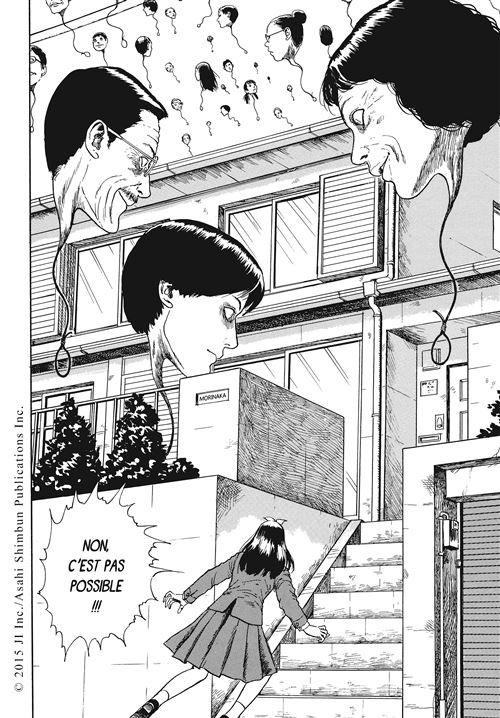 Décliné sous la forme de neuf nouvelles qui sont dans l’ordre chronologique de leur parution japonaise, ce gros manga renferme bien des histoires qui feront frémir à plus d’une reprise. Il faut dire que le talent de l’auteur réside dans deux choses : sa façon automatique de sortir l’horreur d’une situation crédible et l’absurdité de certaines idées qui trouveront un cheminement intéressant. En effet, que penser d’un emboîtement de crânes d’une génération à une autre, formant ainsi une chenille humaine ? Et l’idée de mettre des ballons tueurs à l’effigie des prochaines victimes n’est-elle pas risible ? Pour autant, Junji Ito arrive tout le temps à nous avoir, créant des situations effrayantes, voire glauques, avec des idées extrêmes et parfois loufoques. Ce recueil permet aussi de rentrer dans la psyché de l’auteur, avec, à chaque histoire, leurs origines. Et c’est très intéressant.
