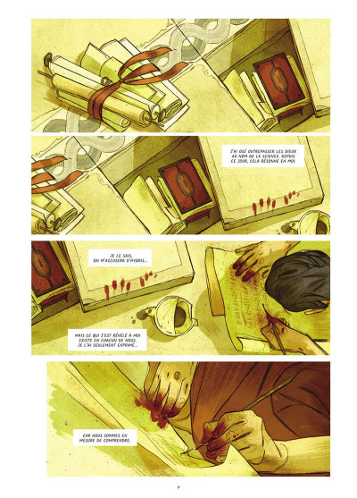 L’histoire débute avec Hérophile qui planque ses recherches sous une dalle, avec les mains ensanglantées. On découvre qu’il est recherché à cause de ses expérimentations sur des cadavres, empêchant ainsi les défunts de rejoindre le repos éternel auprès des dieux. Dès sa capture, l’autrice propose un flashback qui explique comment Hérophile est arrivé à la cour de Ptolémée, alors roi d’Egypte. Très rapidement, l’histoire évoque le projet fou de ce monarque qui souhaite rassembler les plus grands savants du monde dans sa bibliothèque afin de faire de ce lieu le centre de tous les savoirs. Hérophile pense alors pouvoir jouir d’un certain statut, mais il est tout d’abord moqué par ses pairs, plaçant l’esprit et la foi au-dessus du corps, puis il est dévoyé par le roi, qui lui donne comme bureau un sous-sol où il va devoir soigner les malades.