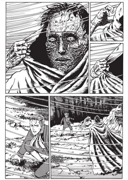 La première chose qui frappe vraiment dans cette adaptation, c’est le style si particulier de Junji Ito. Si l’on est loin de ses dernières œuvres qui fourmillent de détails, on reste dans un dessin simple mais très efficace. Etrangement, lorsque le monstre n’est pas présent, on a une certaine clarté dans l’image, nous réconfortant et prouvant qu’il n’y a pas de danger immédiat. Mais lorsque la créature arrive, l’ambiance change du tout au tout et les traits deviennent plus sombres, plus gras. L’auteur sait très bien ce qu’il fait et il crée une vraie atmosphère autour d’un protagoniste victime de son créateur, victime d’une haine alors qu’il n’a rien demandé. Les thèmes de Mary Shelley sont bien présents, et le mangaka va aller encore plus loin dans son final. Car oui, il ne s’arrête pas à la course-poursuite dans les glaces du pôle Nord.
