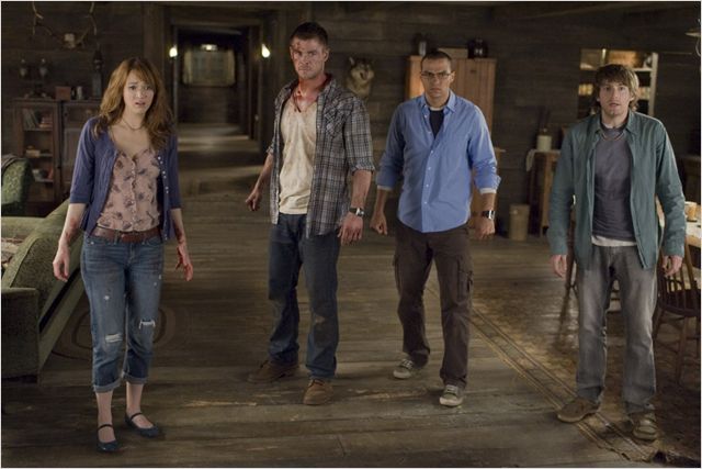 Le scénario de ce film veut se jouer des codes en mélangeant allègrement tout ce qui fait le cinéma horrifique depuis des années. Le synopsis est assez simple, on a cinq jeunes qui partent en vacances dans le chalet du cousin de l’un d’entre eux. Dans le lot, on a le fumeur de pétards, la blonde facile, le sportif, l’intello et la jolie fille pucelle. Tout ce groupe se retrouve dans une cabane au fond des bois, dans un lieu complètement isolé. Mais nous, spectateur, nous voyons aussi que des gens surveillent étroitement le groupe et mettent des paris sur la survie de ces gens. C’est alors que la cabane va être la proie à une attaque de zombies pour ensuite aller encore plus loin. Alors je ne vais pas raconter la suite, ce serait stupide pour ceux qui veulent voir le métrage, mais il faut savoir que le but du réalisateur et du scénariste, c’est de perdre le spectateur pour essayer bien maladroitement de le surprendre. Les références sont multiples et le concept en lui-même est assez intéressant. Mais voilà, on ne peut pas faire un film en empruntant tout ce qui a déjà été fait ailleurs, car on s’ennuie, et on sait souvent à quoi s’attendre malgré la surprise promise. Et puis, quand on détourne quelque chose, on oscille entre deux genres, ou on reste à fond dans l’horreur et on essaye de faire peur, ou alors on va directement dans la parodie et on fait un Scary Movie.
