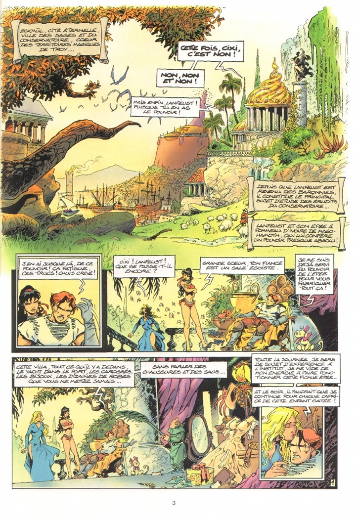 Il ne faut pas oublier aussi que si tout cela a fonctionné, c’est aussi grâce à ce concept génial de pouvoir unique développé par chaque personne. Des pouvoirs qui peuvent très utiles, comme C’ian qui soigne durant la nuit, ou encore celui de Lanfeust qui peut faire fondre le métal. Mais on a aussi des pouvoirs inutiles comme péter par les oreilles, et cela donne parfois lieu à des situations assez grotesques. Et histoire de compléter le tout, les autres pays n’ont pas forcément de pouvoirs, puisque les baronnies refusent d’utiliser la magie, tandis que les Darshanides prient des dieux qui prennent physiquement forme e fonction du nombre de croyants qu’ils ont. Des idées malines, qui donnent réellement de l’épaisseur à l’histoire, mais surtout à l’univers, qui donnera par la suite à des spin-off et des stand alone. Business quand tu nous tiens…