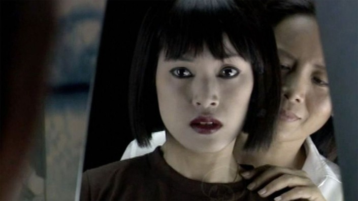 Cependant, le film va profiter de son côté kitsch pour rapidement mettre en place des fantômes, et créer une atmosphère pesante. Lors de la deuxième reconstitution, la jeune femme brûle de l’encens pour s’excuser auprès du défunt, et de façon subtile, le film va mettre en scène le premier fantôme. C’est à la fois sale (le fantôme n’a plus de tête), mais aussi étrange, car le côté mal maquillé fait qu’il règne un sentiment presque crédible. Et petit à petit, les esprits vont se faire de plus en plus présent, vivant dans l’ombre des murs, dans de petites alcôves, suivant alors cette actrice qui va se sentir de plus en plus obligée de rentrer pleinement dans le rôle des morts. C’est fait de façon insidieuse, et les teintes grisâtres, ternes, ne font que rajouter du poids à ce sentiment d’insécurité.
