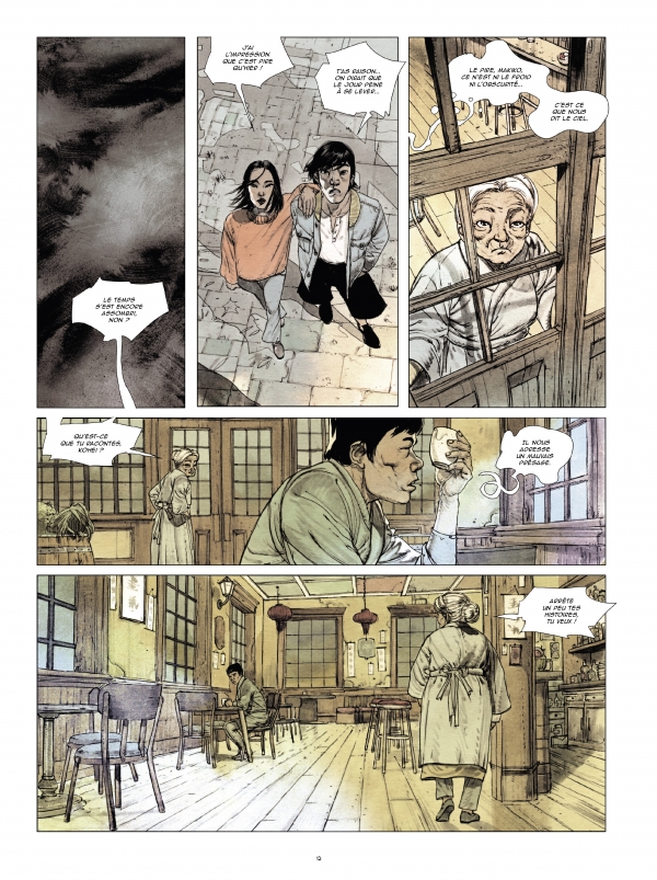 L’histoire se déroule sur une semaine, et la BD est chapitrée en fonction des jours. Cela donne une sensation de compte à rebours qui est plus plaisante, puisqu’on a l’impression que les choses s’accélèrent rapidement, ne laissant aucun temps mort. La lecture est fluide, il n’y a pas d’anicroche et Neige de Sang peut se voir comme un bon page-turner. D’autant plus que la partie enquête se révèle assez intéressante, avec quelques éléments fantastiques qui permettent alors de nous plonger dans une ambiance à la fois mortifère et onirique. De plus, les dessins de Jef sont vraiment beaux. On sent qu’il y a eu un vrai travail de recherche pour coller au mieux à cette ambiance si particulière des années 70, au Japon. On notera un sacré travail sur les couleurs. Le contraste entre les tons sépia de la taverne et le bleu/noir du froid extérieur est vraiment bien rendu.
