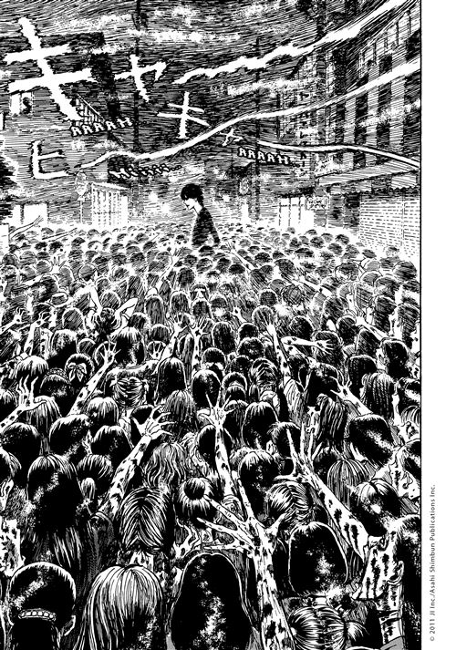 Dans le brouillard, un beau jeune homme habillé de noir annonce de néfastes présages à de jeunes adolescentes, qui vont alors se donner la mort en se tranchant la gorge au cutter. Alors qu’une vague de suicides se propage dans la ville, tout le monde accuse le nouveau venu du fait de sa beauté et de sa ressemblance avec ce spectre qui hante le brouillard de Nazumi. Junji Ito parfait son art en jouant constamment sur le rapprochement entre l’amour et la mort, et à quel point l’amour peut rendre fou. Deux sentiments qui peuvent être très proches en fonction de son état d’esprit. On peut croire que le mangaka dépeint un mal-être fort dans la société nippone, celui où les sentiments ne peuvent être évoqués, et son étouffés jusqu’à se rendre malade.