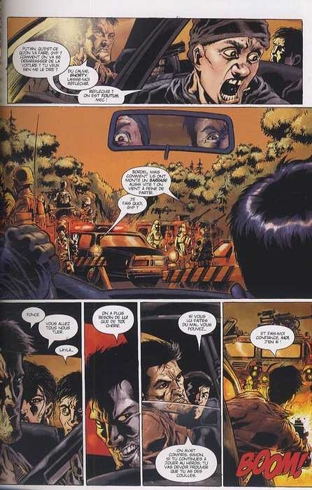 Bref, comme on peut le lire, l’histoire n’a absolument rien d’original et suit un schéma narratif hyper classique. Mais comme tout le monde le sait, classique ne veut pas dire mauvais et c’est tout à fait le cas ici. Etant un one shot, il a fallu que l’auteur signe un scénario dynamique et qui fait la part belle à l’action. Ainsi, le récit est pêchu, on ne s’ennuie pas un seul instant et il y a toujours quelque chose à voir. On ressent vraiment la présence des zombies, qui sont partout et qui vont donner bien du mal à nos protagonistes. Bien entendu, quelques retournements de situation sont à prévoir et certains sont assez sympathiques car presque inattendus. On n’évitera pas l’écueil de l’homme supérieur et égoïste, avec le message sur l’argent, qui va revenir à deux reprises, avec le braqueur psychopathe qui est prêt à mourir pour son sac de billets, puis par des militaires qui veulent s’approprier le sérum pour le revendre. On pointera tout de même une originalité, car on ne sait pas si les morsures et les griffures transforment les gens en zombie ou si c’est seulement le produit déversé. Du coup, on ne sait pas si nos héros mordus deviendront des zombies et c’est assez intéressant.