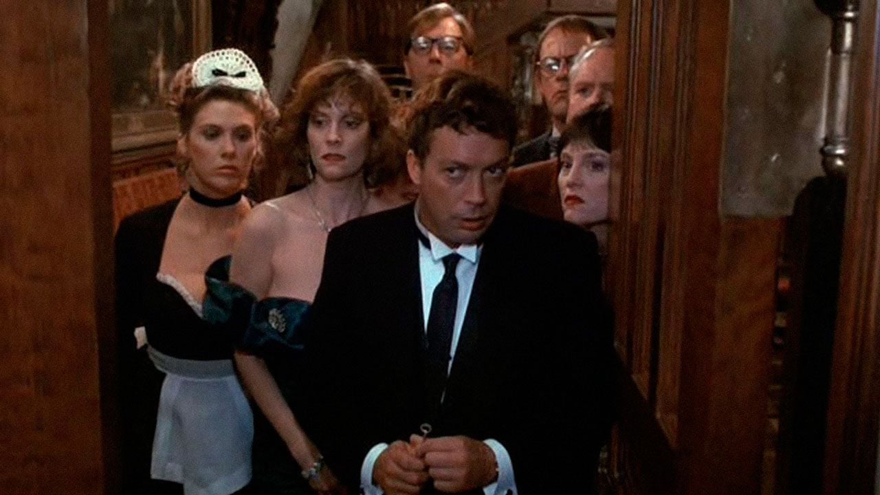 Très vite, il n’est pas difficile de rapprocher le métrage de Jonathan Lynn d’une intrigue digne d’Agatha Christie. Le mystère initial tient à la réunion d’individus qui ne se connaissent guère au sein d’un cadre commun. La narration s’axe autour d’une structure pleine de subtilités. Cela commence tout d’abord par l’étrange invitation qui prend une signification toute autre lorsqu’on aborde le passé des intervenants, les enjeux et le « mobile » à même de justifier leur présence dans ce lugubre manoir. Certes, l’ensemble demeure classique dans sa présentation. Néanmoins, l’ambiance immersive est au rendez-vous, ne serait-ce qu’au travers de la compagnie du majordome Wadsworth pour animer les investigations et amener le spectateur à s’y prêter.