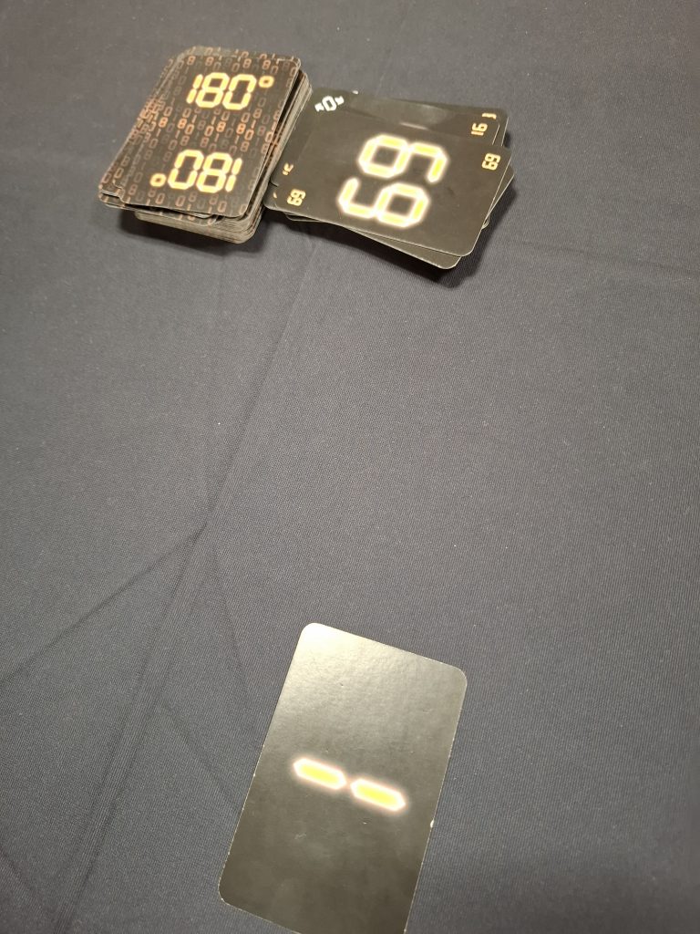 Un petit jeu de défausse où il faut jouer des cartes soit toujours croissantes soit toujours décroissantes, chaque ludiste ayant des cartes numérotées en main et devant s’en débarrasser pour l’emporter. La particularité est que toutes les valeurs sont écrites de façon électronique (le 1 est formé de deux barres verticales l’une sur l’autre, le 8 contient sept barres etc) et peuvent se lire dans un sens ou l’autre. Certaines cartes permettent justement d’en retourner d’autres, un 81 peut devenir un 18 etc. ce qui peut aider à jouer les cartes de plus ou moins grande valeur. C’est plutôt malin et sympathique, il n’y a pas des tonnes d’effets à retenir, ce qui est appréciable.
