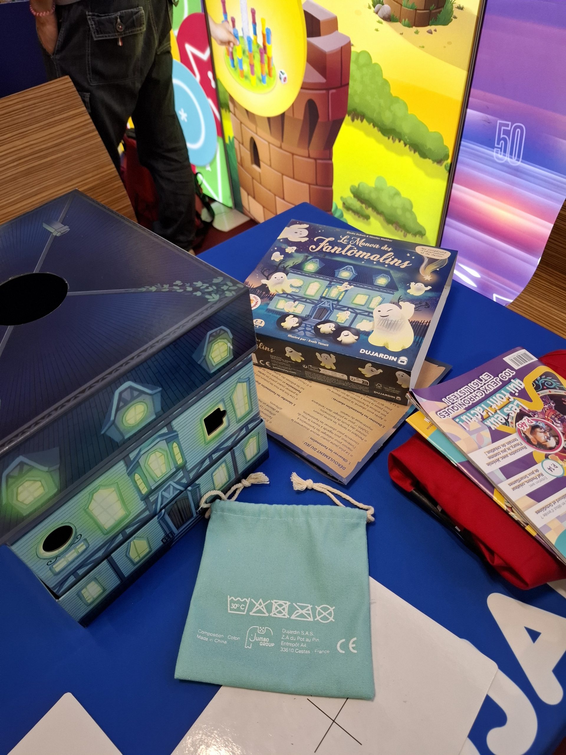 Un jeu coopératif dans lequel les enfants doivent récupérer divers objets tout en évitant les fameux fantômes. A mon tour je lance les dés, j’avance un des pions d’autant de cases que le nombre inscrit puis je tourne la roue en fonction de l’autre résultat. Cette roue déplace les fantômes sur le plateau de manière plus ou moins aléatoire grâce à la piste magnétique cachée dans la boîte. Si le fantôme touche un pion, celui-ci doit fuir et parfois refermer une sortie. Si toutes les sorties se bloquent c’est perdu. Si tous les pions ont retrouvé tous leurs objets et parviennent à s’échapper, c’est gagné ! C’est sympa, plutôt mignon, plutôt aléatoire par nature et vraiment pas si simple, même pour un adulte. Mais l’effet waouh du jeu est saisissant !