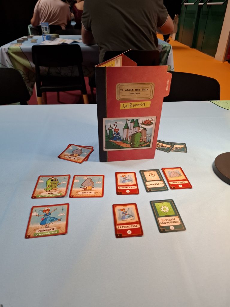 Un jeu coopératif en campagne dans lequel une pièce de théâtre est jouée : la princesse est amoureuse d’un troll mais sa famille ne l’entend pas de cette oreille. L’objectif de chaque scénario (de ce que j’en sais pour le moment) est de réunir la Princesse et le Troll sur des cases adjacentes. On dispose sur la table des verbes (déplace, mange, utilise sa capacité etc) et l’on pioche des personnages. Je peux jouer des personnages autour des verbes pour qu’ils suivent la phrase formée. Par exemple, Rocher mange Arbre (auquel cas le Rocher se déplace et prend la place de l’Arbre adjacent, oui, oui ça fonctionne), Princesse avance vers Troll, Troll utilise son effet (qui est de manger ce qui lui est adjacent), etc… Tout un tas de petits casse-têtes sont présents dans la boîte, sous forme d’une grande pièce de théâtre comme je l’ai dit, découpée en actes divisés en scènes, chacune comportant ses personnages, ses actions et ses twists scénaristiques… L’univers (autant graphique que thématique) est très chouette, on sent tout le potentiel de la proposition et l’on se demande bien ce que les auteurs nous ont concocté… On sent qu’on n’est pas prêt !