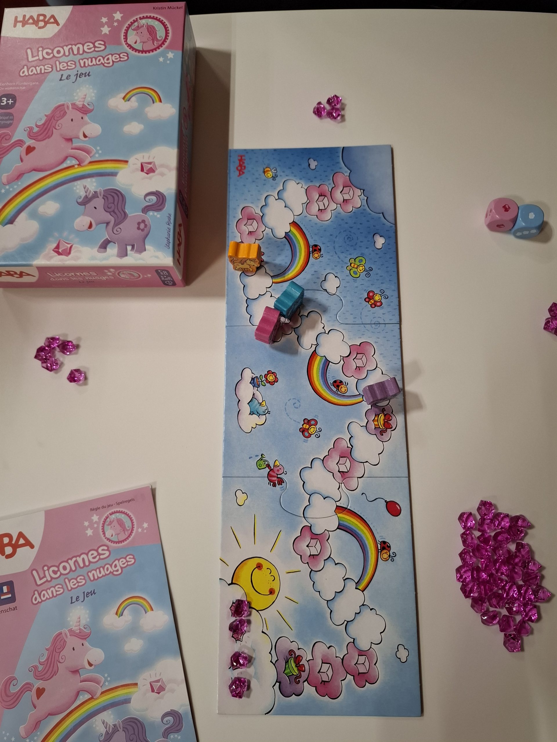 Un jeu pour enfants dans lequel chaque jeune ludiste lance un dé et avance sa licorne d’autant de nuages et puis applique l’effet de la case atteinte, comme prendre un raccourci, gagner des gemmes ou donner des gemmes aux autres. Rien de fou en soi mais c’est mignon.