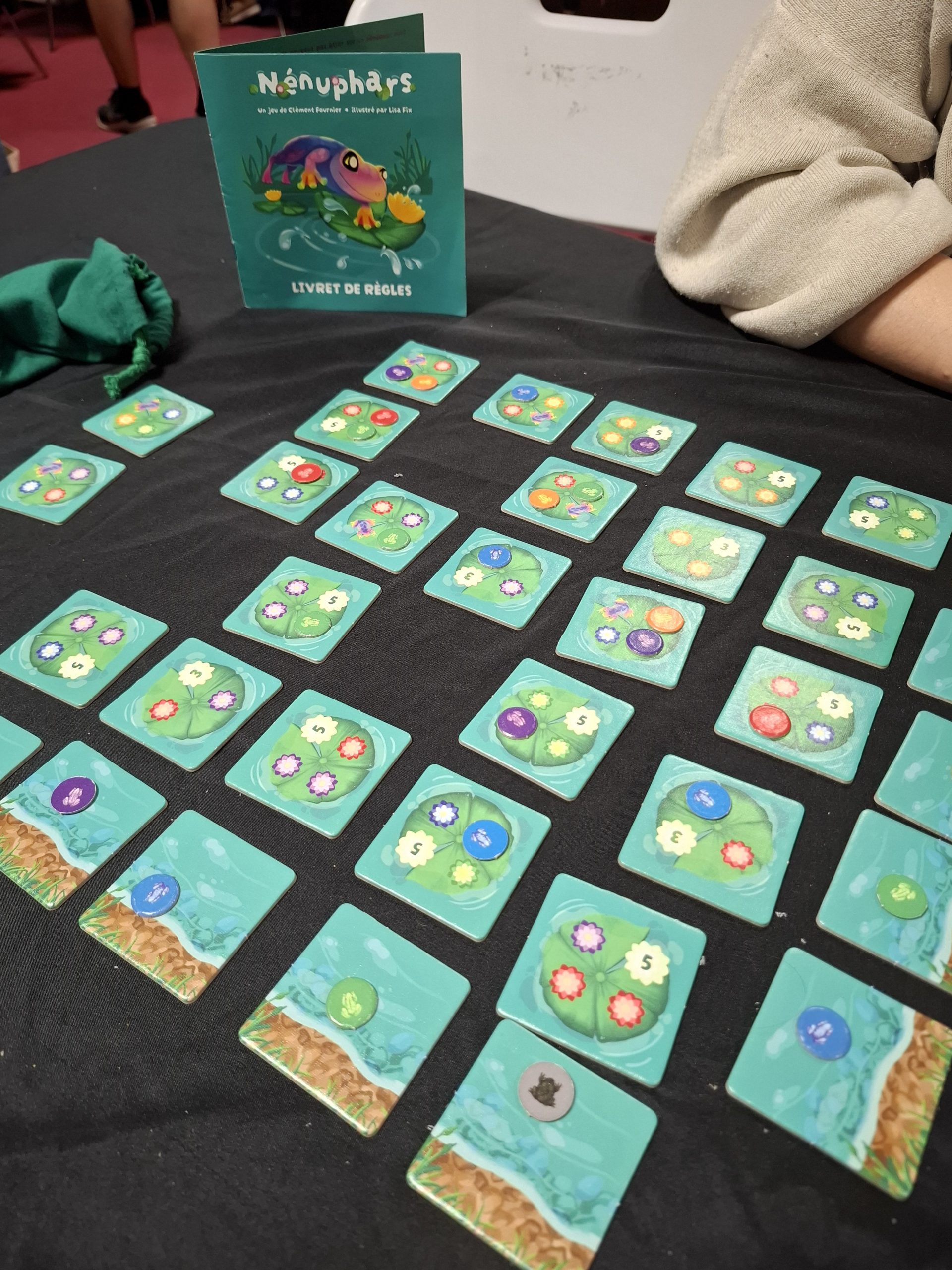 Un jeu dans lequel on fait avancer des grenouilles sur des nénuphars, la grenouille devant s’arrêter sur une fleur de la bonne couleur. Si je pose la dernière grenouille sur un nénuphar, je le récupère et je peux répartir les grenouilles sur des nénuphars dans la même ligne ou la même colonne, provoquant des réactions en chaîne le cas échéant. Un gros souci de game design selon moi vu qu’on joue surtout pour ne pas terminer de nénuphar donc on passe son temps à ne pas faire avancer la partie. Dans tous les cas on s’ennuie beaucoup, ce qu’on fait n’est pas passionnant.