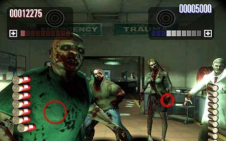 Conforme à la volonté des développeurs de nous proposer un spectacle décomplexé, les transitions prêtes à sourire pour faire se succéder des tableaux variés et néanmoins sans surprise. Le manoir, l’hôpital, la fête foraine, le train, le marais et la prison. Des environnements souvent trop sombres qui auraient gagné à un minimum de lisibilité et de clarté afin de ne pas plisser les yeux sitôt que l’on voit un coin d’obscurité où jaillissent des zombies. Dans pareil cas de figure, seul le viseur qui passe au rouge vous indique la présence d’une cible, à moins que vous ne connaissiez le niveau par cœur (indispensable pour avoir un bon score).