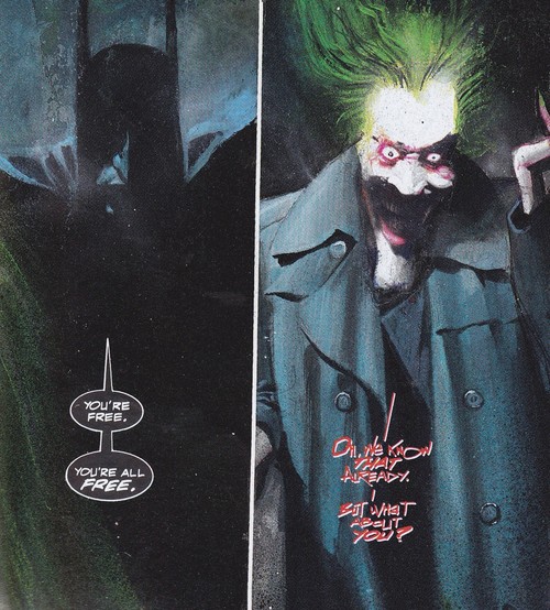 Grant Morrison, désormais célèbre, signe un script inédit et encore jamais vu dans l’univers de Gotham City et plus précisément dans l’asile d’Arkham. Situant son récit au confluent de deux âges, il va tisser d’un côté la mythologie du lieu, avec l’histoire de son créateur, et de l’autre il va montrer comment ce lieu vivant devient le purgatoire de Batman. L’histoire est hautement symbolique et dénote complètement avec les récits habituels du méchant contre l’homme-chauve-souris. Sous la houlette du Joker, Batman va devoir se confronter à son passé et subir quasiment les mêmes épreuves que ses ennemis au sein de l’asile, par des médecins. On va y voir des ennemis connus comme Double-Face ou Gueule d’Argile (dans un état maladif avancé) mais aussi de moins connus comme le Dr Destin ou encore Zeus qui n’auront ici qu’une fonction de rite de passage pour Batman, se découvrant et essayant de sortir plus fort et grandi de cette épreuve. Pour ajouter au mythe de l’asile, l’histoire avec Amadeus Arkham est très forte et démontre toute l’importance de ce lieu, autel de la folie, dans l’univers de Batman.
