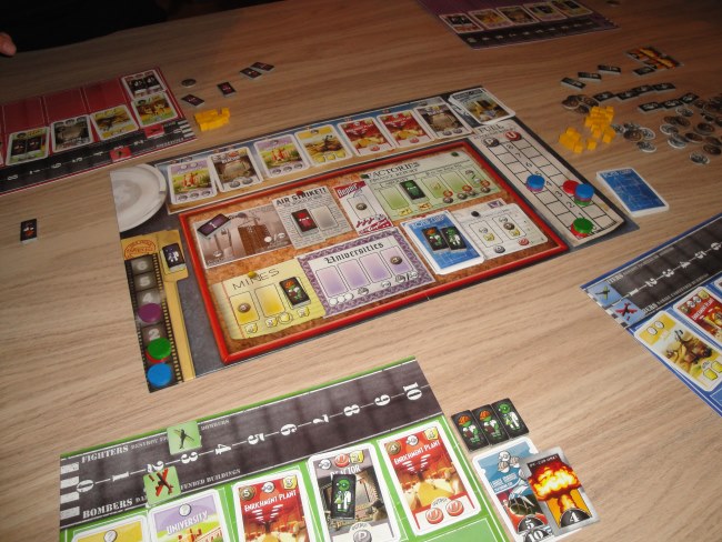 Le but du jeu est très simple. Suivant le nombre de joueurs, un seuil de points différent est à atteindre. Pour marquer des points, il faut construire des bombes, soit à l’uranium, soit au plutonium. Seulement, pour récolter ces énergies, il faut de la main d’œuvre et une monnaie d’échange, qui se nomme le Yellow Cake. Parmi cette main d’œuvre, le joueur commencera avec seulement quatre petits bonhommes ouvriers. Sur le plateau central, les joueurs, à tour de rôle, posent leurs personnages pour faire divers action. Un joueur peut construire des bâtiments, qui sont des cartes, donnant soit de l’argent, soit des Yellow Cake, soit de l’énergie pour les bombes. Mais il peut aussi recruter des contremaîtres, très utiles pour récupérer des bâtiments gratuitement ou pour construire des bombes, ainsi que des scientifiques, qui sont essentiels pour la fabrication des bombes. Le joueur peut aussi choisir les bombes qu’il va lancer ainsi que d’augmenter sa jauge d’uranium ou de plutonium. Enfin, il peut décider de prendre des Yellow Cake, de l’argent ou encore d’augmenter son niveau d’attaque de bombardiers (qui détruisent les bâtiments adverses) ou de chasseurs (qui détruisent les bombardiers adverses). Si tout cela semble complexe, il n’en est rien. En effet, le plateau est très clair et relativement compact, permettant une reconnaissance immédiate des différentes zones. Ensuite, si un pion est placé sur une case, il est impossible de poser un autre pion. Il faut attendre que le joueur décide de perdre un tour en reprenant tous ses pions. La force de The Manhattan Project réside dans sa multitude d’actions et de résolutions tout en restant très ergonomique et peu prise de tête. Tout est indiqué sur le plateau et si jamais le joueur ne sait plus quoi faire, il peut se référer à une carte d’aide de jeu bien foutue. Bref, sur le plateau et le papier, le jeu a de quoi convaincre.